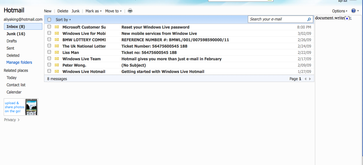 Wow. E-Mail. I can get information on penile implants! And prescription drugs from Mexico! And Nigerian Internets Scams. Sweet! It's like regular mail. But it's HOT. Awesome! Can't believe I still have this account. Hit me up! Aliyaking@hotmail.com. I'll hit you back--eventually. HA.