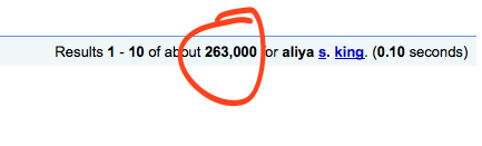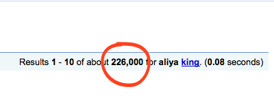 Now you’ve got a quarter of a million hits to slog through. And that’s because it’s looking up any site that lists the words “aliya” and “king” even if it has nothing to do with me. (Lots of hits about Arab “kings” and their wives named “aliya.”)
