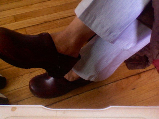 Gave birth. Dropped excess poundage. Clogs went in the way-back of my closet. I gave TG’s mom all my maternity clothes when she was pregnant earlier this year. Tried to throw in the shoes too. She said, “um, no thanks. I’d rather just have a backache.”