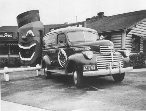 To the left of the photo, you can see the "coon" that served as the front door to the Coon Chicken Inn. You walked in through the mouth of the caricature. Directly in front is a "coon car." These vehicles were used for delivery.