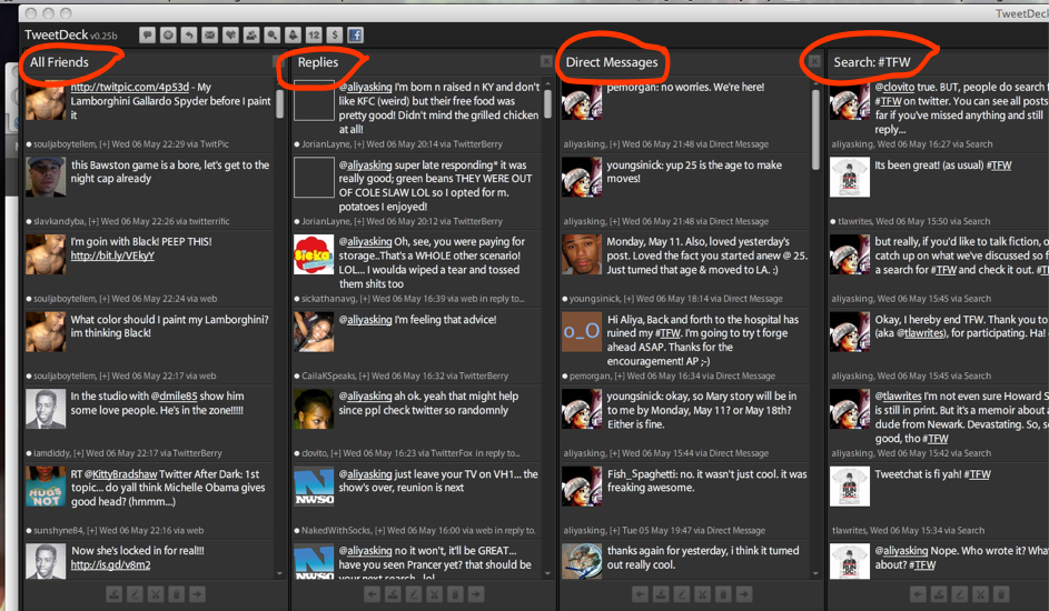 It’s much more streamlined. Instead of just a bunch of vertical messages that keep coming at you, TweetDeck is set up in columns. The first column on the left are the updates from my Friends. Next to that are Replies people have sent to me. Next to that are Direct Messages I’ve received. And the last column is a search column I created.