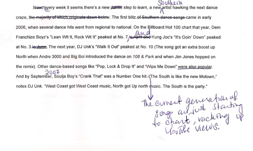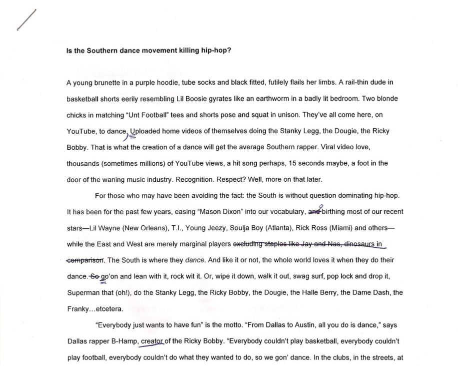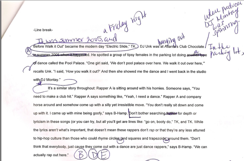 We’ve all learned that if you can’t write something better than how your subject said it, then just let the subject speak. In my Southern dance draft, I changed the sentence that starts with, “Some clubs in the South even show the music videos…” into the artist’s own words. Also, if a quote doesn’t quite have the right punch as you initially thought, take it out or find a replacement. Don’t fall in love with quotes that don’t make sense.